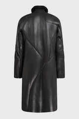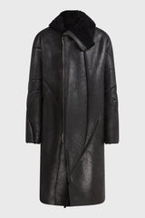 Distortion trench coat in black Merino Shearling Wool from Leon Emanuel Blanck featuring with asymmetrical stitching, regular fit, two pockets, slightly exaggerated elbow, two-way zippers and an inner pocket.