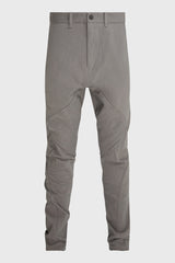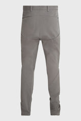 Forced perspective chem long pants in grey cotton cashmere twill from Leon Emanuel Blanck featuring with symmetrical and regular fit, four pockets, button and zipper closure, slightly exaggerated knees and optional belt loops.