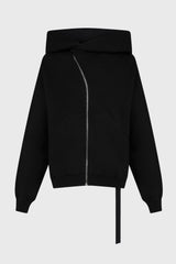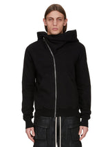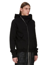 Mountain hoodie in black compact heavy cotton jersey from Rick Owens DRKSHDW FW25 Concordians. This mountain hoodie is above hip length with long sleeves. It has a curved asymmetrical zipper closure, a small funnel neck and a large pointed hood. It has two front patch pockets, ribbed cuffs and a waistband signature single seam running down the centre back spine.