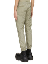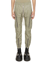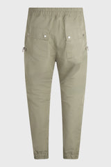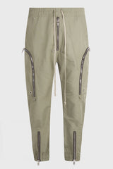 Bauhaus cargo in celadon tech faille from Rick Owens ss25 Hollywood. These bauhaus cargo pants are full length, with a slim fit, and an elasticized waistband with drawstring. They feature a bela exposed center zipper with snap detail at bottom, rounded bauhaus zippered pockets on both thighs with eyelets, front shin splits with zippers and elasticized cuffs. They have side front welt pockets with rivet detail, square back pockets with flaps and snaps, and front yokes and seams with double top stitching.