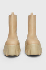 Beatle mega tractors in parchment/parchment lamb leather from Rick Owens SS25 Hollywood. These beatle mega tractors are above-ankle height. They have geometric side panels in stretch elastic, an angular heel counter with top stitching, a back loop pull tab and a rounded bozo toe. They feature a double height mega tractor sole.