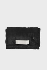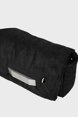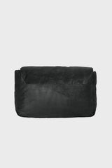 Big pillow griffin in black blister lamb leather from Rick Owens FW25 Concordians. This big pillow griffin is a large rectangular soft padded bag with a front flap with a palladium indented easy-grip bevel and magnetic closure. It has one ponticello d-loop on front, an inner pocket with 9 card slots and a second inner zippered pocket. It features a long thin leather strap with a palladium tone brass hook which ties on one side, or can be detached to create a clutch.