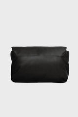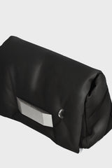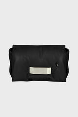 Big pillow griffin in black glossy butter calf leather from Rick Owens FW25 Concordians. This big pillow griffin is a large rectangular soft padded bag with a front flap with a palladium indented easy-grip bevel and magnetic closure. It has one ponticello d-loop on front, an inner pocket with 9 card slots and a second inner zippered pocket. It features a long thin leather strap with a palladium tone brass hook which ties on one side, or can be detached to create a clutch.