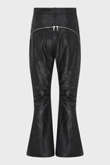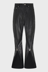 Bolan banana in black sugar calf leather from Rick Owens FW25 Concordians. This bolan banana is a high waisted, slim fit, 5 pocket jean with a floor-length boot cut. They have a concealed button fly and a waistband with center button, belt loops and pocket rivets and back patch pockets with topstitching. They feature a long zipper running from center butt, curving around the hip to the hem. It can unzip at back to expose the butt, and also zip up from the hem to expose an inner flared panel in the leg.