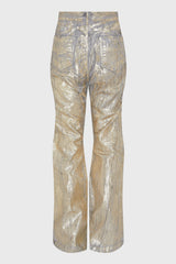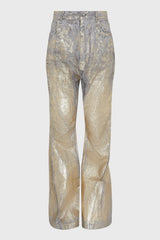 Bolan bootcut in gold megacrust stretch denim from Rick Owens SS25 Hollywood runway. This bolan bootcut is a high waisted, slim fit 5 pocket jean with a floor-length boot cut. They close with a waist button and concealed button fly. They have a waistband with belt loops and pocket rivets and back patch pockets with topstitching.