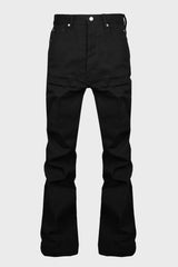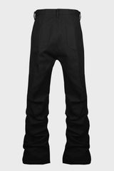 Bolans in black cotton whipcord from Rick Owens FW25 Concordians runway. These bolans are a high waisted, slim fit 6-pocket jean with a floor-length boot cut. They close with a waist button and concealed button fly. They have a waistband with belt loops and pocket rivets and back patch pockets with topstitching.