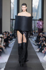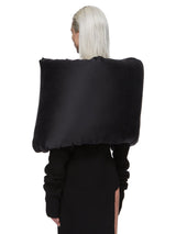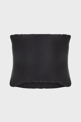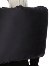 Donut cowl in black silk charmeuse from Rick Owens fw23 Luxor Runway. This donut cowl is a circular tube filled with dense, heavy duvet which is designed to be worn around the neck or shoulders. This item contains a mix of goose down and mallard duck down. This mediumweight fluid silk charmeuse has a soft enzyme finish.