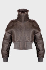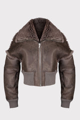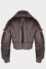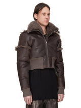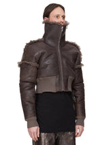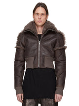 Dracucollar jkt in darkdust curly shearling from Rick Owens FW25 Concordians runway. This dracucollar jkt is waist length with long sleeves and a dropped shoulder. It has a centre front zipper closure and a wide ribbed waistband cuffs and a concealed zipper pocket in the left forearm. It features an extended length collar that can be worn up or down and holds its shape thanks to it being reinforced with fusing material. It is fully lined and has two internal zippered pockets.