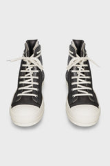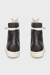 Sneaks in bronze megacrust stretch denim from Rick Owens DRKSHDW AW25 Concordians. These sneakers are above-ankle height and feature seven eyelets, laces, a zipper on the inside ankle for easy fastening, toe caps and shark-toothed bumper soles.