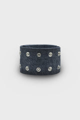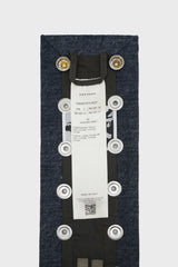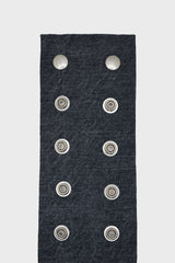 Strobe neck band in washed grey denim from DRKSHDW FW25 Concordians. This strobe neck band is a denim strap with all-over snaps, to be worn around the neck.