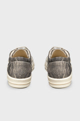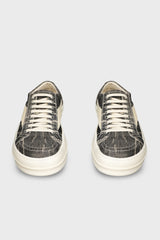 Vintage sneaks in bronze/milk/milk calf leather from Rick Owens AW25 Concordians runway. These vintage sneaks are under-ankle height and have eight eyelets with laces, toe caps and shark-toothed bumper soles. They feature a triangular leather applique on the side foot, a padded ankle and contrast stitching.