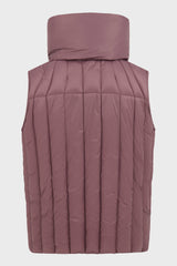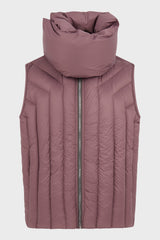 Vest liner in amethyst recycled nylon from Rick Owens fw23 Luxor. This vest liner is hip length and sleeveless. It is a lightweight quilted duvet, with a geometric stitched pattern. It has centre front zipper opening with placket, slit pockets in the side body with concealed snaps, and a ribbed neck. It features a detachable mountain collar which can be worn hanging down, or closed to create a funnel neck.