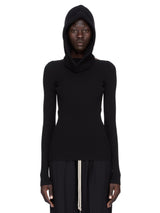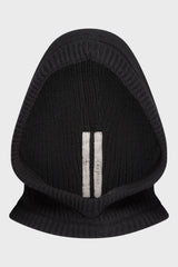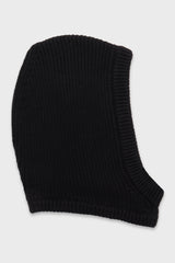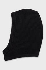 Hood in black boiled recycled cashmere knit from Rick Owens. This hood fits over the head like a snood and has a thick ribbed edge. It can be worn as a hood or down around the neck as a scarf.
