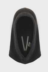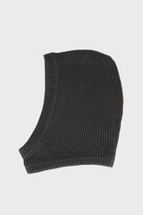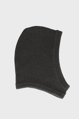 Hood in darkdust boiled recycled cashmere knit from Rick Owens. This hood fits over the head like a snood and has a thick ribbed edge. It can be worn as a hood or down around the neck as a scarf.