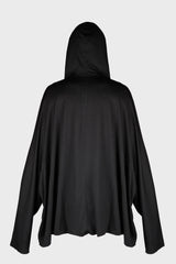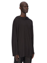 Hooded tunic in black silk wool jersey from Rick Owens FW25 Concordians runway. This hooded tunic is hip length with long sleeves. It has a large hood that drapes at the front neck, and a wide square body.