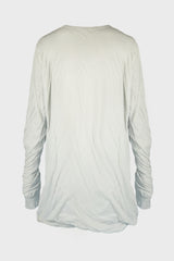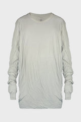 Jumbo double longsleeve tee in pearl unstable cotton from Rick Owens AW25 Concordians. This jumbo double ls t is below hip-length, has long sleeves and a ribbed round neck. It features a double layer of fabric, with the hem and sleeves on the fold, creating a draped effect. It has the signature single seam running down the centre back spine. This lightweight cotton jersey is semi-transparent with a soft handfeel.
