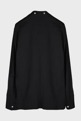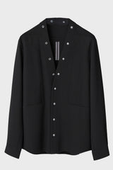 Larry fogpocket shirt in black wool sable from Rick Owens AW25 Concordians. This larry fogpocket shirt is hip-length and has long sleeves with snap cuffs. It has a deep v neck with four functional visible snap closures, and snaps continuing around to the centre back neck. It features two fog breast pockets with a vertical opening and internal snap. It has level shoulder seams, a back yoke and a hemline with beveled sides.