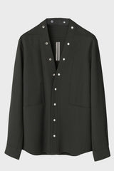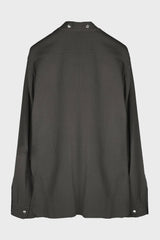 Larry fogpocket shirt in dark dust wool sable from Rick Owens AW25 Concordians. This larry fogpocket shirt is hip-length and has long sleeves with snap cuffs. It has a deep v neck with four functional visible snap closures, and snaps continuing around to the centre back neck. It features two fog breast pockets with a vertical opening and internal snap. It has level shoulder seams, a back yoke and a hemline with beveled sides.