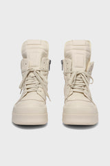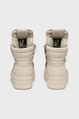 Mega Bumper Geobasket in milk and milk full grain calf leather from Rick Owens. These mega bumper geobaskets are above-ankle height. They feature an extended tongue with webbing tab, signature geometric panels and a padded back counter with topstitched geometric lines. They have 7 eyelets with contrast laces, a zipper on the inside ankle for easy fastening and double height, mega bumper, shark-tooth soles.