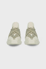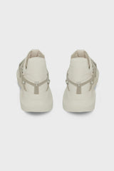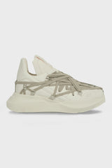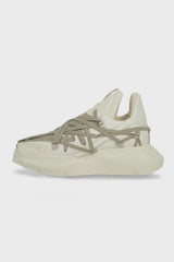 Megalaced geth runner in milk albino lamb leather from Rick Owens FW25 Concordians. This megalace geth runner is under-ankle height. They have a cushioned back rising to a point, an integrated angled side stripe and a beveled extended tongue with webbing detail. It has a thick geometric geth sole with an angled, extended heel and feature the signature megalace detail in a pentagram shape covering the front.