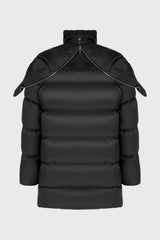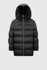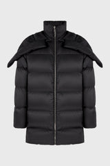 Hooded cyclopic coat in black quilted recycled longue saison from Moncler + Rick Owens FW24.