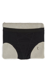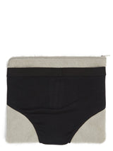 Pentabrief Pouch in pearl and black long hair pony from Rick Owens FW22 Strobe runway. This Pentabrief pouch is a rectangular clutch bag with top zipper and ponticello d-loop detail. It features a pentabrief with pentagram stitching attached to the pouch at the leg seams. This leather is a hair-on cowhide