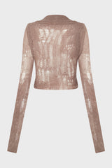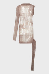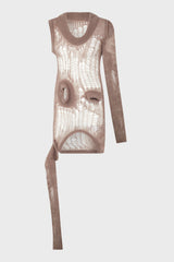 Spider banana in dust net knit from Rick Owens ss24 Lido. This spider banana is below-the-hip length. It has long cape sleeves which can be worn with the arms in or out of sleeves. It is double layered, has a wide knit collar and can be worn peeled down with the top layer hanging down, or as a regular top with two layers. It also features two ribbed round cut outs. This is a net knit with uneven holes.