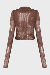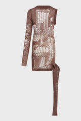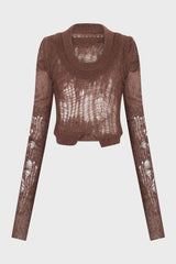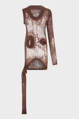 Spider banana in henna net knit from Rick Owens ss24 Lido. This spider banana is below-the-hip length. It has long cape sleeves which can be worn with the arms in or out of sleeves. It is double layered, has a wide knit collar and can be worn peeled down with the top layer hanging down, or as a regular top with two layers. It also features two ribbed round cut outs. This is a net knit with uneven holes.