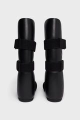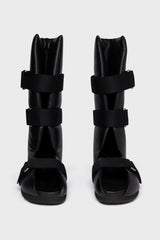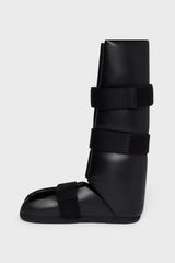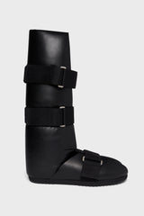 Splint sandal in black/black groppone cow leather from Rick Owens ss24 lido runway. These splint sandals are below-knee height. They have a rigid foam outer that wraps the sides of the foot and around the back leg and ankle. They have a rounded centre back cut out, that is secured in place with adjustable webbing straps. They have an open front and features a shark-toothed sole.