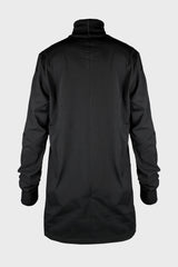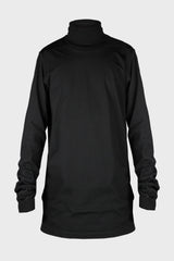 Surf t in black classic cotton jersey from Rick Owens FW25 Concordians. This surf t is below-the-hip length with long sleeves. It has a high ribbed turtle neck and cuffs. It features the signature level shoulder seams and single seam running down the centre back spine.