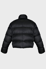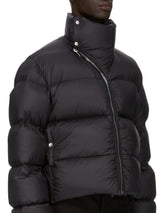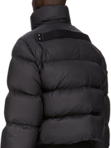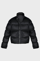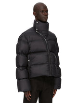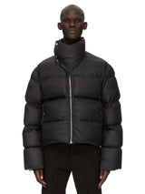 Turtle jkt in black light nylon from Rick Owens FW25 Concordians. This turtle jkt is cropped below the waist with a centre front zipper and high tube-neck collar with bias zipper and snaps. It is padded and quilted with horizontal stitching lines and has side front welt pockets with snaps. It features a signature cotton webbing strap, with rivet detail, across the back yoke. It has two inside zippered pockets.