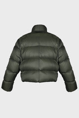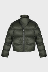 Turtle jkt in bosco light nylon from Rick Owens FW25 Concordians. This turtle jkt is cropped below the waist with a centre front zipper and high tube-neck collar with bias zipper and snaps. It is padded and quilted with horizontal stitching lines and has side front welt pockets with snaps. It features a signature cotton webbing strap, with rivet detail, across the back yoke. It has two inside zippered pockets.