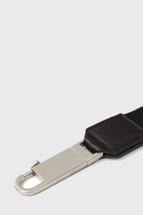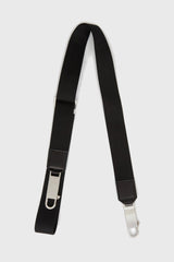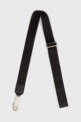 Webbing strap in black cotton webbing from Rick Owens. This webbing strap is an adjustable bag strap made in thick cotton webbing. It features a big snap hook on either end in palladium tone brass. This strap is designed to be sold as an addition to all of our bags with detachable leather straps. It is embossed with the Rick Owens logo.