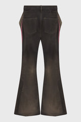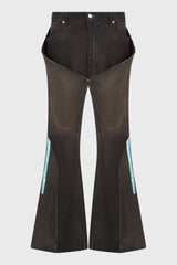 Slivered bootcut in 13oz brown overdyed denim and 13oz dark dust overdyed denim from Rick Owens. This slivered bootcut is a high waisted, slim fit 5 pocket jean with a floor-length boot cut. They have a waistband with button and concealed button fly, belt loops and rivets. They have angular front pockets and back patch pockets with topstitching. They feature an angular panel running from the outer hip into the crotch, creating deep geometric pockets on the front thigh. The outer layer is a overdyed denim material with panels of metallic fabric that creates a geometric, wide-leg/bootcut silhouette.