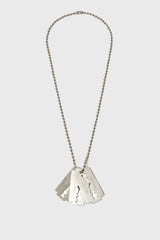 Blade necklace from UNDERCOVER. It is a brass ball chain necklace with laser engraved logo charm.