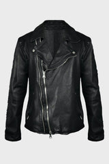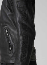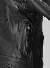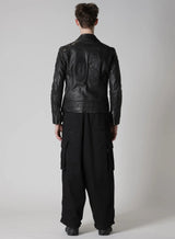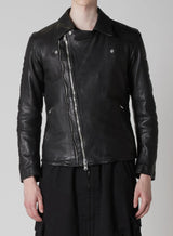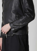 from Yohji Yamamoto x BACKLASH. This is a Double Riders Jacket crafted from Japanese Horse Leather. The garment's soft-washed finish creates a rich texture, while Backlash collaboration patch details add a bespoke touch, inspired by their first collection. The piece shrinks by about 5% after garment washing, enhancing its luxurious feel.