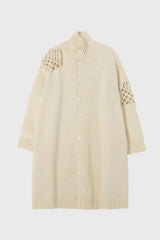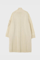 Stitching macrame turtle cardigan in off white from Yohji Yamamoto. This cardigan, crafted from Uruguayan wool, features partial macramé knitting and a turtleneck design. Its roving material, reduces fuzz while enhancing texture and roundness. The careful design incorporates hand-knit macramé for a standout look, making it a unique, artisanal garment.
