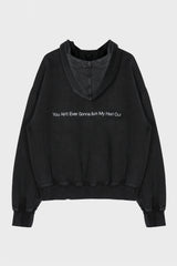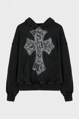 Goth hoodie from MISBHV. It is a Heavyweight french terry hoodie in black with Fading throughout, Graphic with crystal-cut accents at front, Graphic printed at back, Exposed seams and raw finishing, Rib knit hem and cuffs and Dropped shoulders.