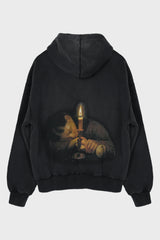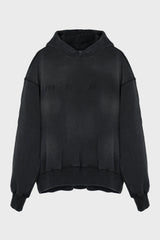 Renaissance hoodie from MISBHV. It is a Heavyweight french terry hoodie in black. It has  Fading throughout, Graphic printed at front and back, Exposed seams and raw finishing, Rib knit hem and cuffs, and Dropped shoulders.