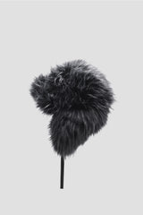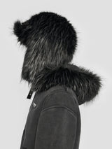 Faux fur hat with ear-flaps in grey from MISBHV. It has a Fading throughout, Tied at chin and Logo at front.