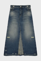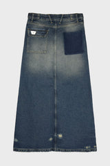 Pacific wash denim skirt from MISBHV. It is a flared denim skirt in blue with Fading throughout, Distressing.