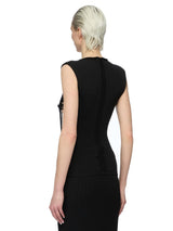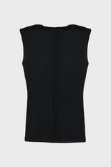 Tanja top in black wool from Rick Owens AW25 Concordians runway. This tanja top is hip length. It has a rolled round neck with cap sleeves. It features cut-outs on front chest, and bust, with a slightly shredded front and a full back with a centre back channel down the spine. It is body revealing on front.