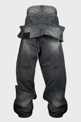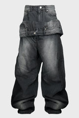 BLACK DENIM FRONT FULL LAYERED PANTS