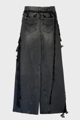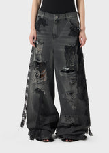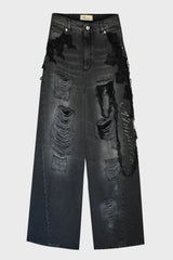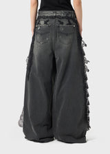 Destroyed extra baggy jeans with lace trim in grey gunmetal from BLUMARINE. It is an extra baggy jeans in distressed stone-washed denim with rips and scalloped lace trim, It has Ripped legs, Scalloped lace profiles, Five-pocket style, Puddle bottom, B monogram label at back and Regular fit.