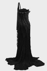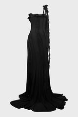 One-shoulder dress in jersey with inlays from BLUMARINE. It is a long viscose crêpe jersey dress with raw-cut inlays, straight neckline, one-shoulder ruffle strap, front slit, and short train.