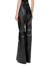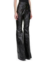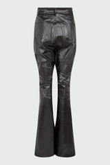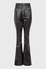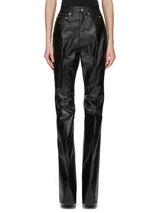 Bolan bootcut in black coated stretch denim from Rick Owens SS25 Hollywood. This bolan bootcut is a high waisted, slim fit 5 pocket jean with a floor-length boot cut. They close with a waist button and concealed button fly. They have a waistband with belt loops and pocket rivets and back patch pockets with topstitching.