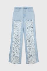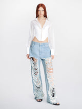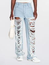 Classic denim frayed pants from Dion Lee. Unisex mid-rise pant crafted in a rigid cotton denim. Featuring distressing and fraying at front leg with laser-etched diamond border. Designed to sit at the hip for a relaxed fit. Four pocket construction and leather logo patch at back.