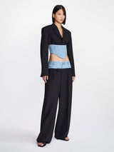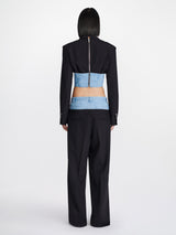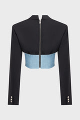 Float corset blazer from Dion Lee. This is a cropped blazer cut in a luxurious single wool suiting. Featuring contrast undercorset in garment washed rigid denim. Dipped hem and encased boning. Notch lapel collar, padded shoulders, and full length sleeves with logo engraved eyelet snaps at cuffs. Centre back exposed metal zip. Fully lined.