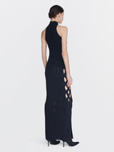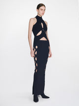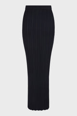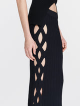Snakeskin long skirt from Dion Lee. Mid-rise midi length skirt with pointelle knit stitches and ribbing for a textured finish. Signature lustrate fabrication is compact with a dry, crepe hand feel. Tonal yarns are plaited together for a subtle two-tone finish. Detailed with an open cable knit at sides and elastic integrated at waistband.