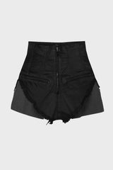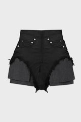 Dirt cutoffs in black wax black wax stretch denim from Rick Owens DRKSHDW FW25 Concordians. . These dirt cutoffs are cut high on the hip with a tight fit. They have an extra high waist, front jean pockets with rivets, back jet pockets and pocket bag linings which hang below the raw cut hems, front and back. They have double topstitched denim seams, and open with a centre back zipper. This version has a shredded fringe front and back.